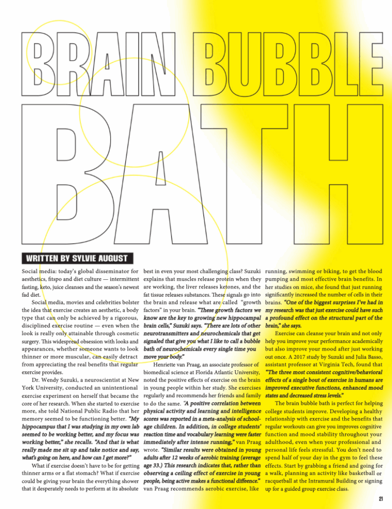 Sylvie produced an article for issue 33 titled “Brain Bubble Bath.” In the article, she explains that exercise, in addition to being good for your body, has strong benefits for your brain. “Brain Bubble Bath” introduced the idea that exercise can help clear your mind.