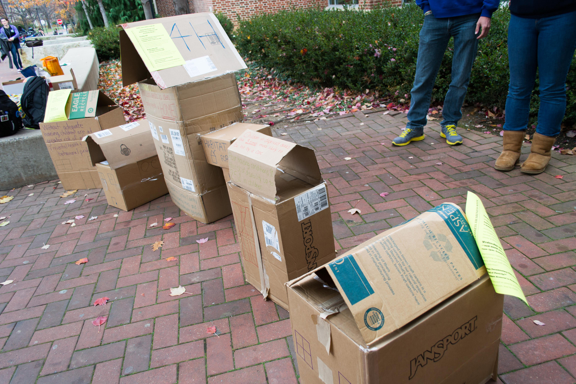 To kick off National Hunger and Homelessness Awareness Week, a handful of clubs set up cardboard homes in from of the Pollock Road entrance. Set up began around 9 or 10 a.m. and the town displays lasted for hours.