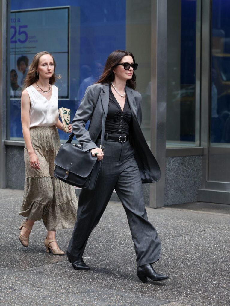 Hathaway runs the sidewalk with her black Coach bag. Making business-casual chic again, she wore a grey and black ensemble of suit pieces. For added bling, her pendant necklace comes from Jemma Wynne. Simply put, office wear never looked so good.