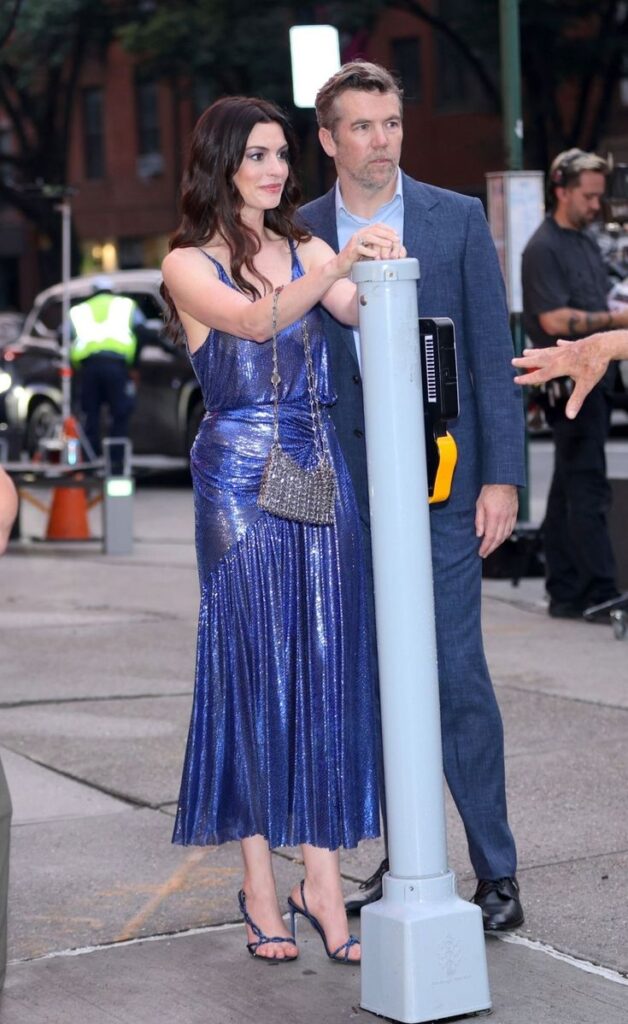 For a night out, our favorite journalist chose a metallic dress from Rabanne’s Resort 2026 collection. Glistening under the street lights, her Nano 1969 bag from the brand helped her shine. (Though this look is stunning, no amount of sparkle could ever outshine Hathaway.)