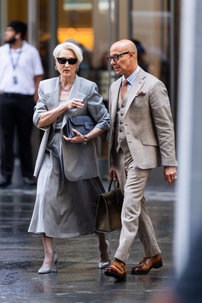 Stanley Tucci, known as Nigel in the film, famously stuck around after Andy Sachs’ departure at “Runway Magazine.” Now, in 2025, his character’s style is getting an update. He’s seen above wearing a taupe suit and Berluti leather briefcase. The color palette of this look, with its darker taupe hues, is phenomenal. With this level of sophistication, VALLEY clearly approves.