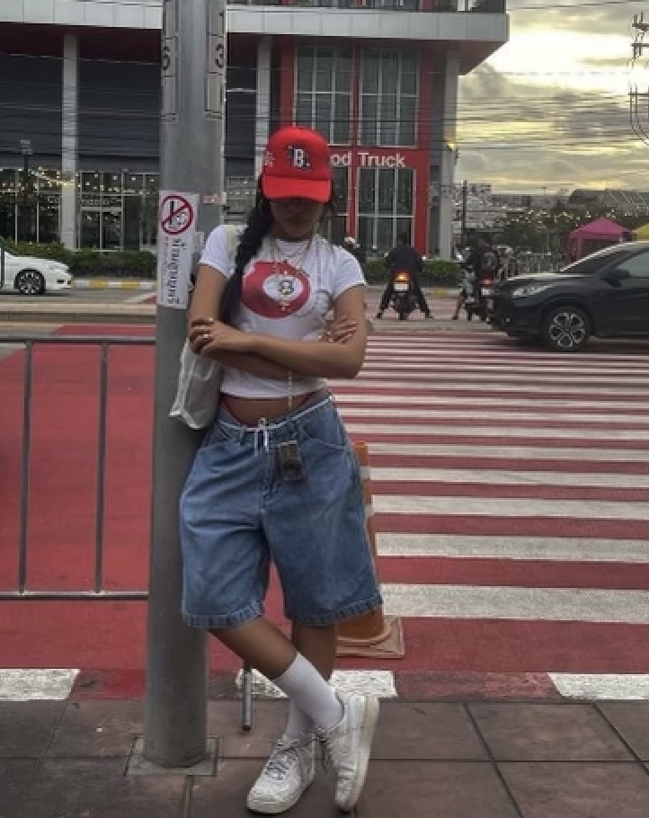 Thursday’s look took a turn toward nostalgia. I wore oversized jorts, a white sports bra-style top, maroon cowgirl boots, a matching maroon leather purse and an old, worn baseball cap. At this point, I was really missing New York and wanted my outfit to remind me of the fashion I often saw back home.