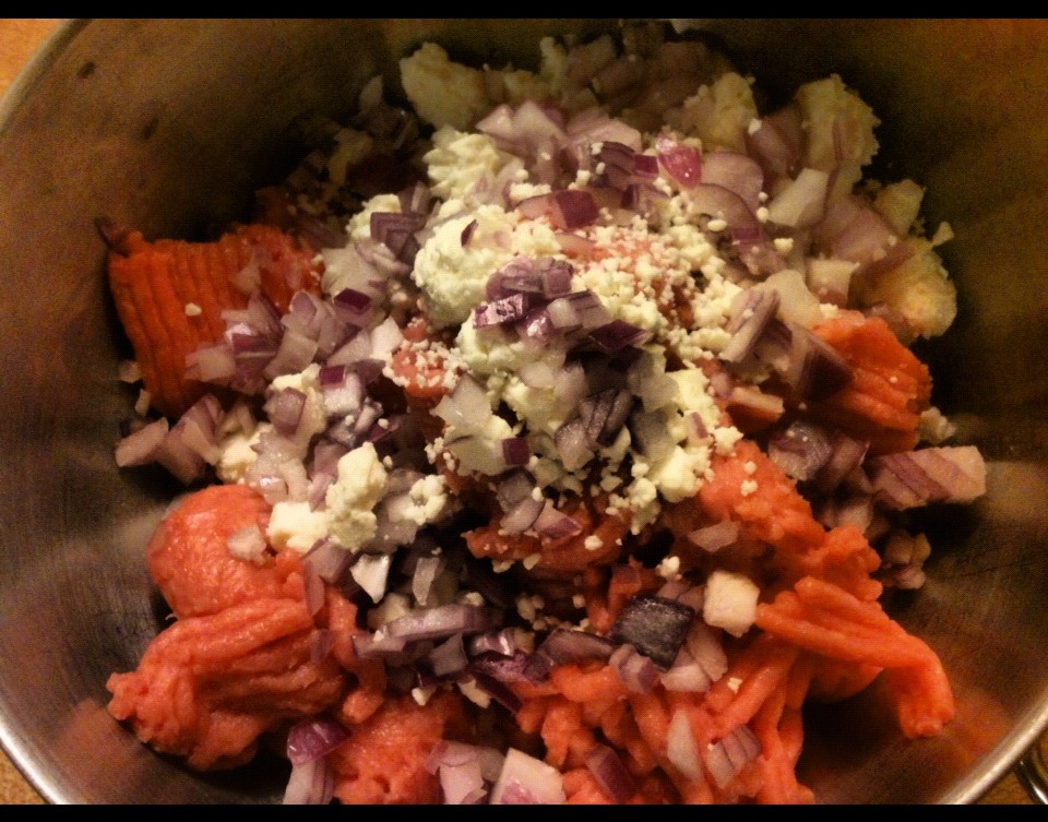 1. Use your hands to mash the ground turkey in a bowl with the feta and onion.