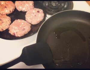 2. Shape burgers into about 1-1 ¼ inches thick so they cook quickly. Put the pan on medium heat and add the olive oil. Let warm for about a minute, then place burgers in pan. Flip when base turns golden brown.