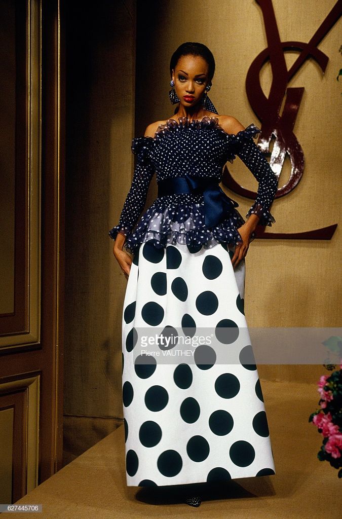 Fashion houses such as Valentino and Yves Saint Laurent began including polka dots in their spring/summer collections, and these unique pieces started appearing on runways everywhere. The new looks put a twist on the classic design and experimented with different patterns and textures, breaking the boundaries of fashion. The look featured below is from Yves Saint Laurent’s Spring/Summer 1992 collection.