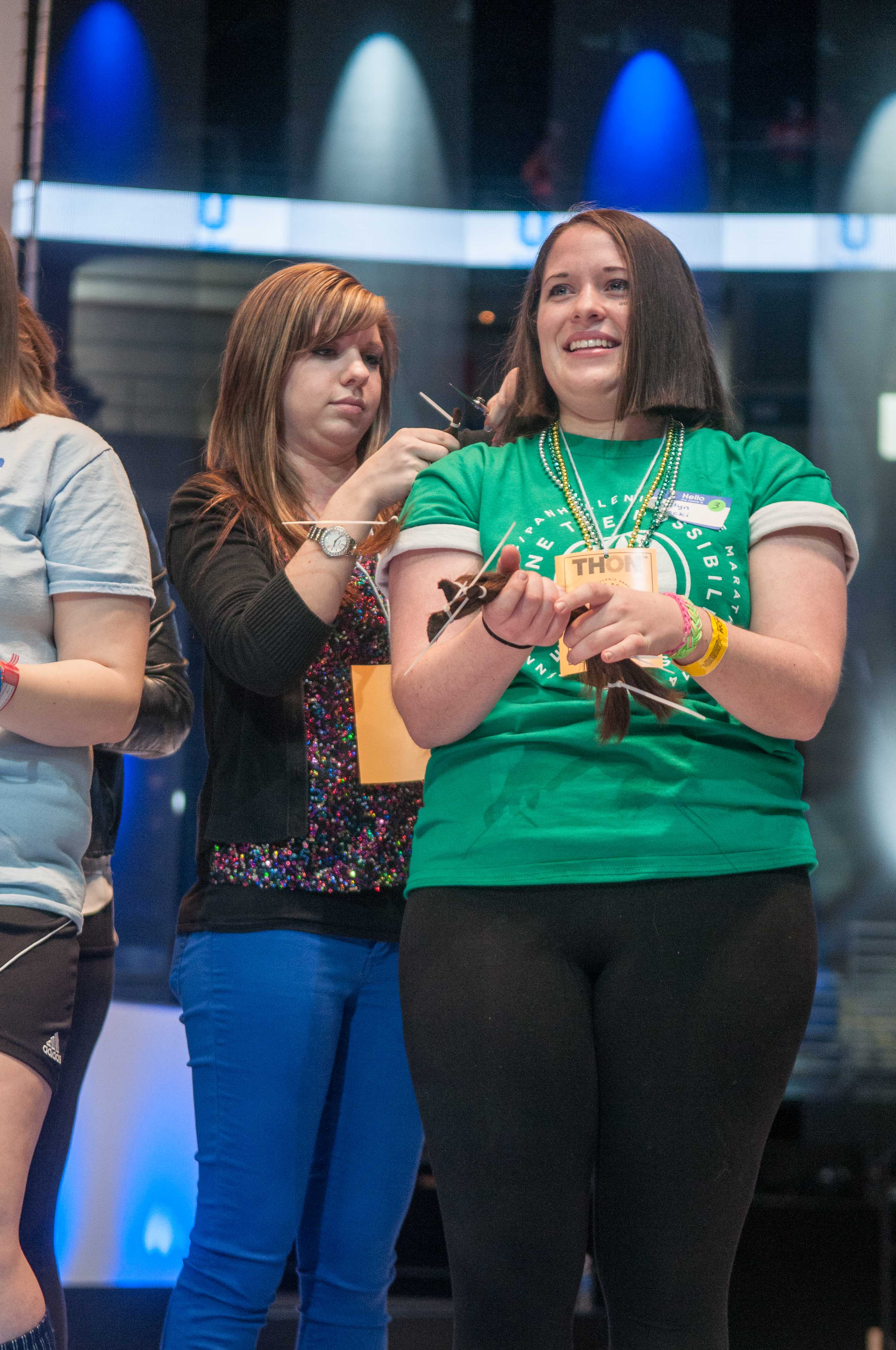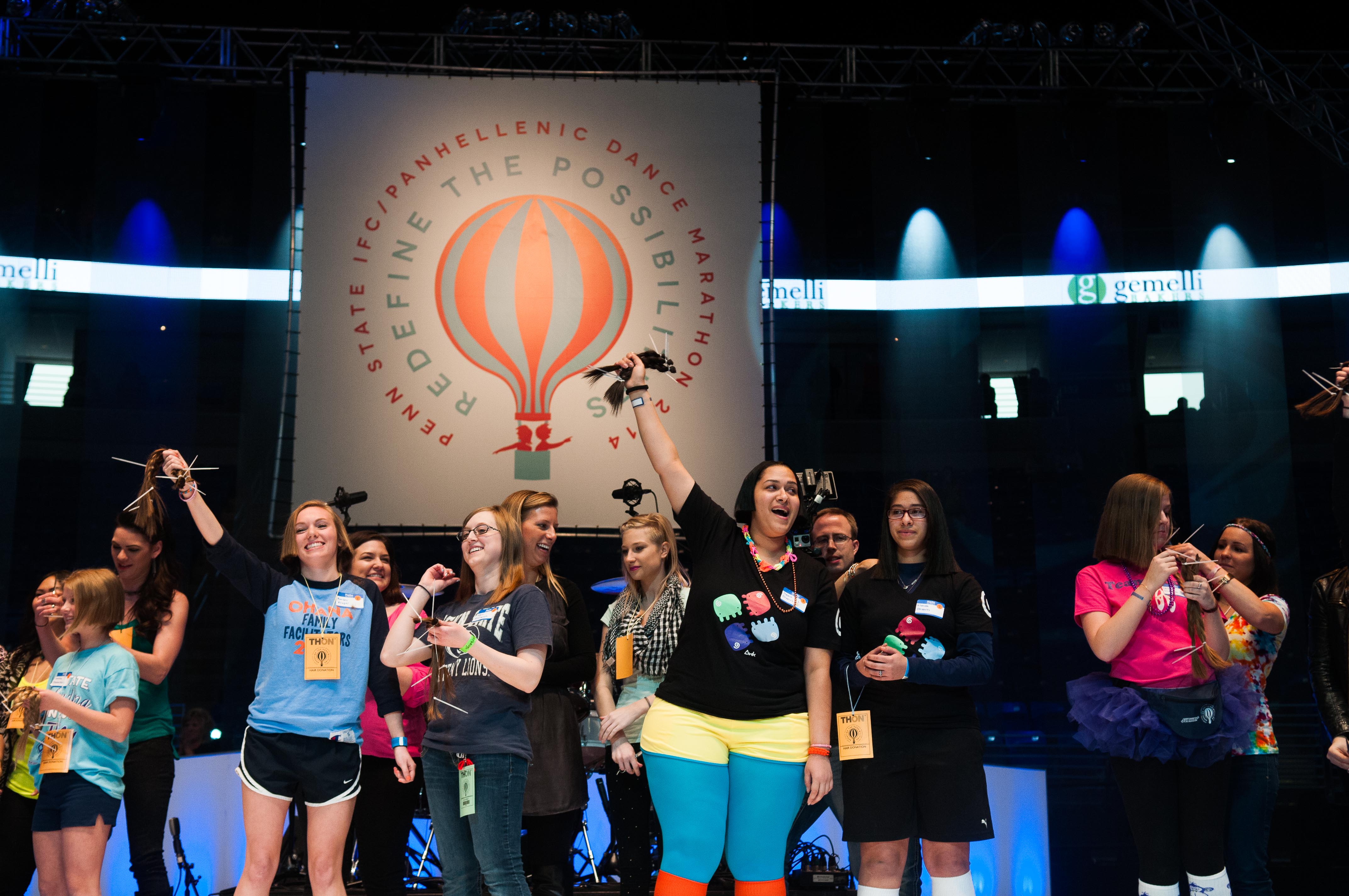 Young and old, male and female, the stage was packed with people ready to make a difference in the lives of kids with cancer. Family Carnival captain Mick Gallagher wanted to be involved with coordinating the hair donation this year through Special Events as a way of “being closer connected to the kids,” while local hair stylists Jodi Meyer and Kaity Herb of Vive Bella generously donated their time and skills because they were “curious about what THON was all about.”