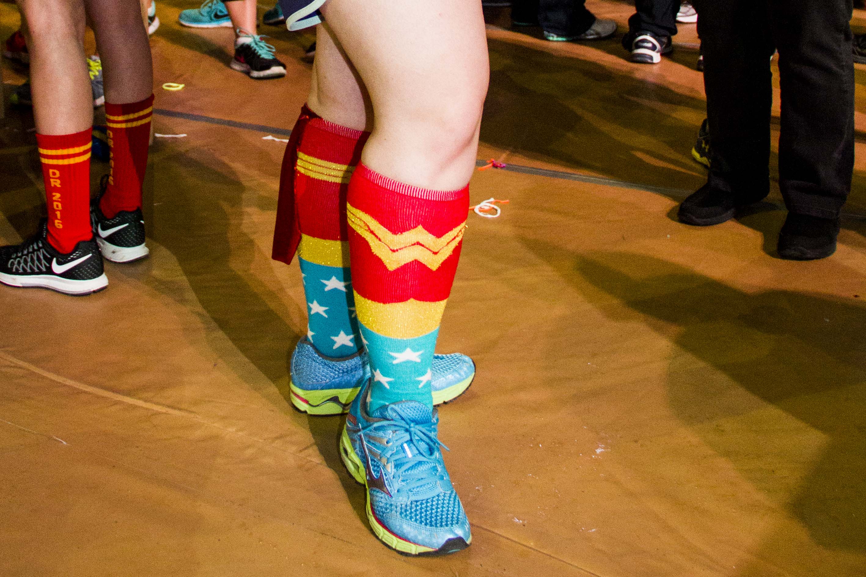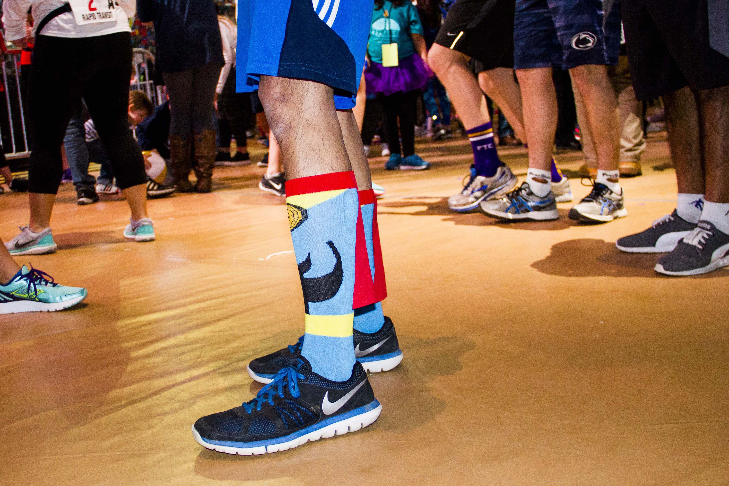 Mark Chandley, a Dancing Relations member, proudly showed off his caped socks which he admits were solely bought for THON 2016.