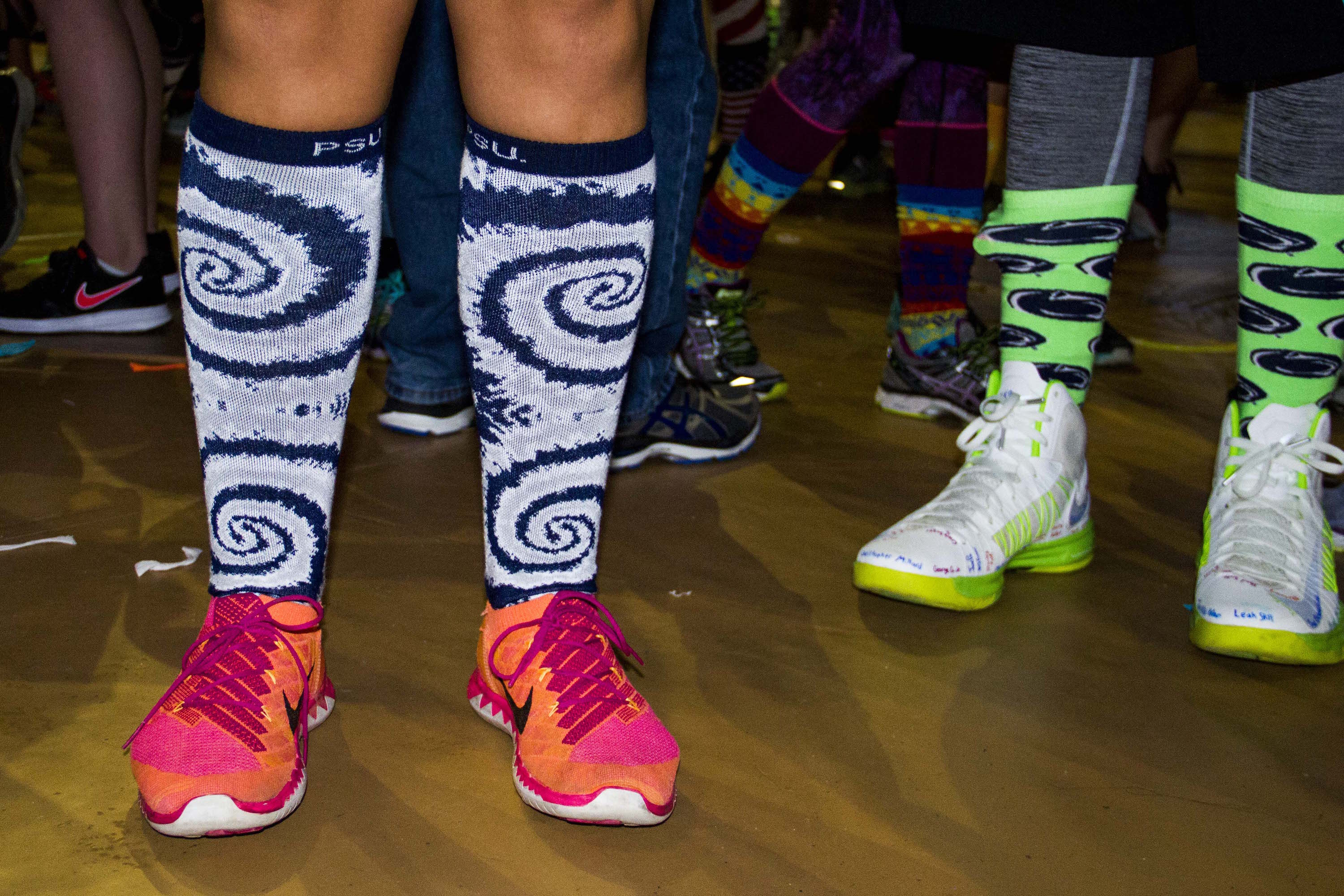Superhero themed socks were a big hit at this year’s THON, as seen worn here by dancer Kinsey Marley. Marley said that since she was dancing this year she knew she had to “bring it” with the sock and shoe game, and bring it she did.