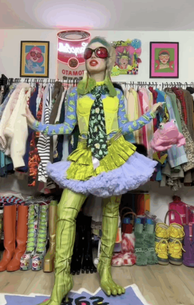 In one of Camposarcone’s pinned videos, she is doing a classic “get ready with me” video. Camposarcone says “get ready with me for work” while holding giant green heels with the bottoms shaped like frog feet. She then layers her outfit with a frog patterned workout set, an electric yellow corset, a big blue and yellow tutu and of course, a pinkish-purple frog purse to finish it off.