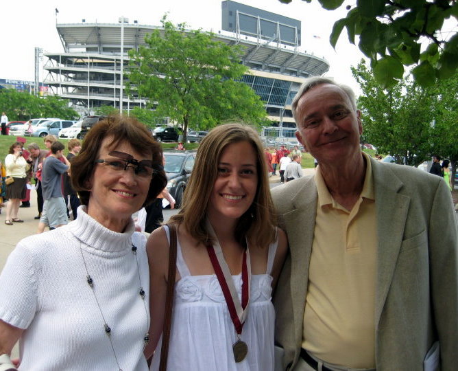 Photo: Noelle and her grandparents at her high school graduation — with a familiar stadium in the background.