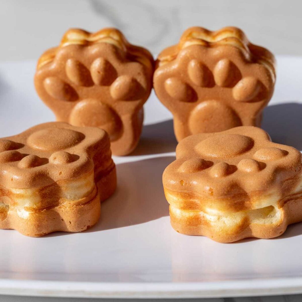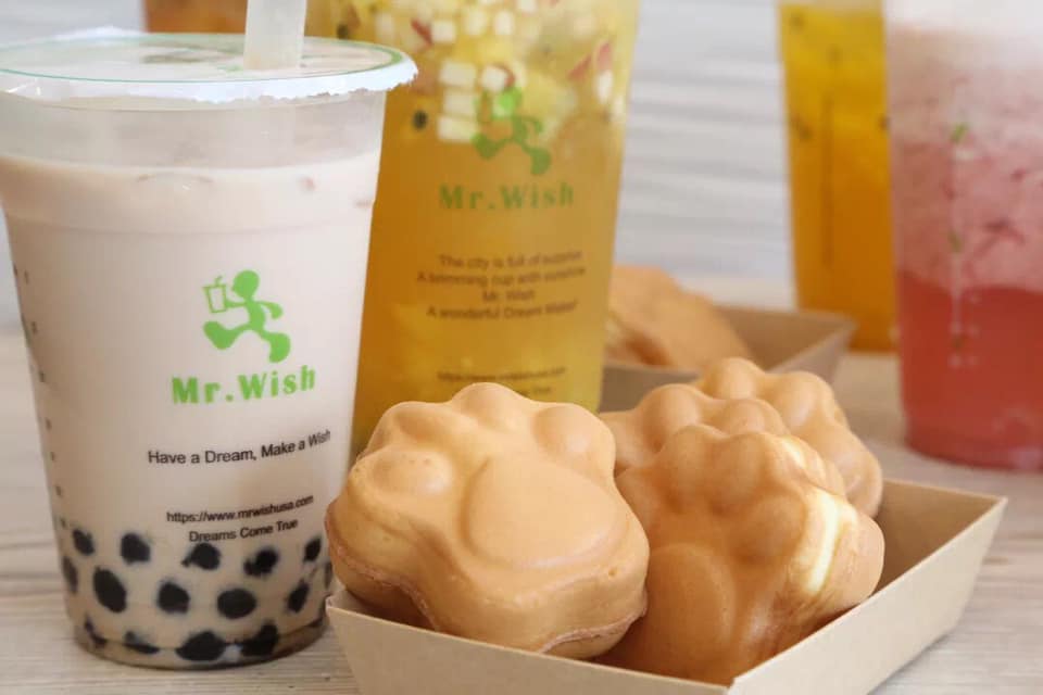 Their paw-shaped waffle cakes are priced at $4.25, raised by 50 cents for a custard-filled four-pack. The small store is adorned with neon signs, greenery, order kiosks and a booming speaker echoing music off the walls. Mr. Wish is also in the same building as Hibachi Express and Aone Mart, facilitating a busy ambiance filled with chatter and order numbers.