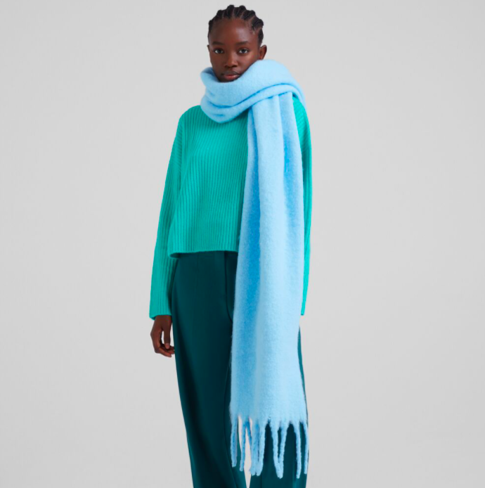 This solid-colored scarf comes in both bright orange and baby blue and can offset any boring outfit with a singular pop of color. Another sustainably made scarf with fibers are made from recycled plastic from water bottles, this chunky scarf retails for only $19.90. Style with any plain puffer or monochrome outfit with a matching beanie to stand out from the crowd.