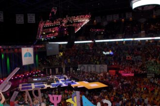 “A life-sized polar bear with a pink bow stood on a step and waved at the crowd.”