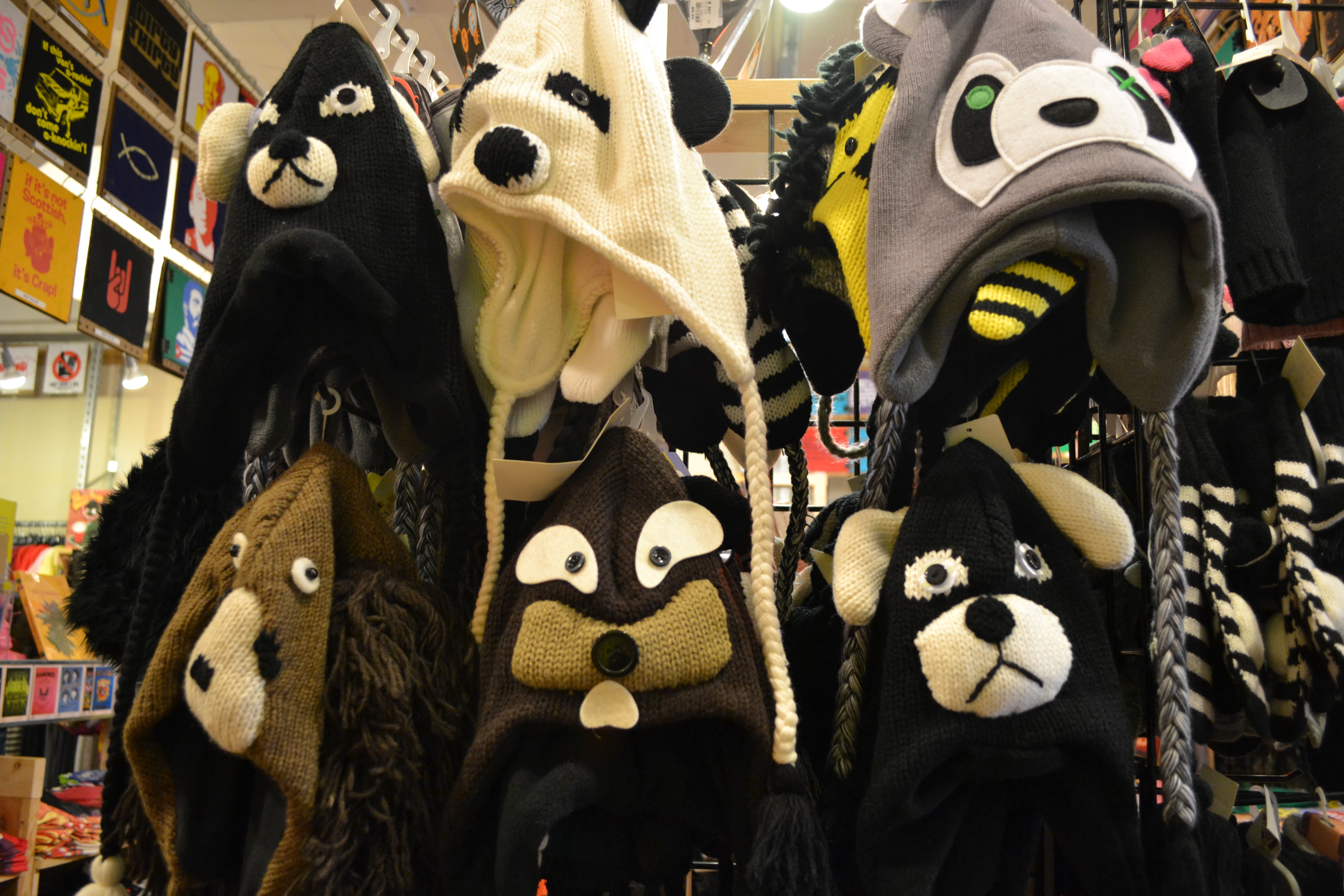 Down the street at People’s Nation, located at 126 East College Avenue, there’s a ton of crazy and unique winter items. The store carries furry hats with attached mittens. These creative inventions have extra long earpieces extending from the hat with pockets for your hands. The hats come in a variety of different faux furs with or without animal ears.