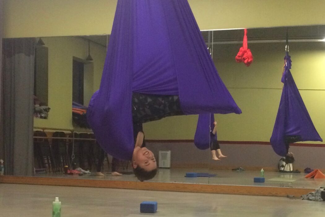 I am fairly new to yoga, but over the past semester, I have been going to a class at least once a week. While I am by no means an expert, or even any higher than amateur status, I know the names of the positions pretty well and can balance in a tree pose for about a minute on a good day. My flexibility has increased and I’ve noticed a bit more upper body strength (thanks to downward dog and plank holds), so I felt like trying out an aerial yoga class would be pretty much the same as a normal yoga class but with some added flying. Just some good, wholesome fun with a dash of exercise.