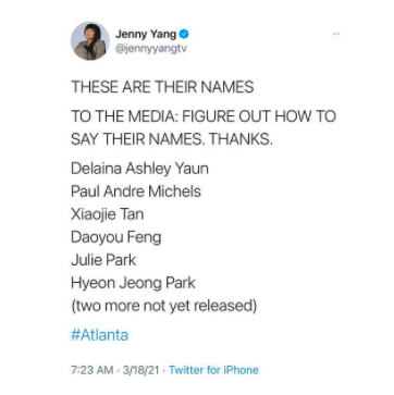 On Tuesday, eight people were shot and killed at three different spa locations in the Atlanta area. According to the New York Times, six of these people were Asian American women.