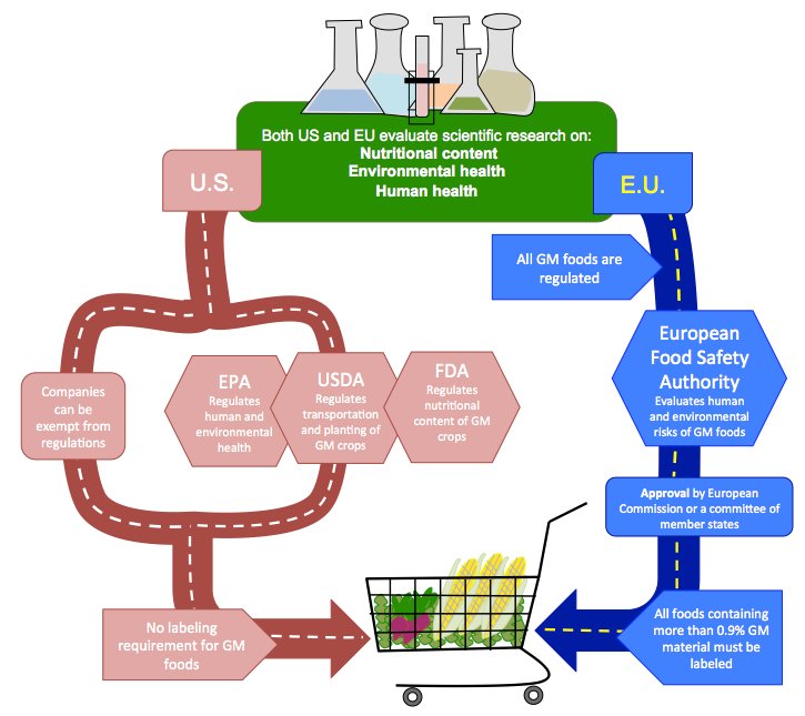 One of the major differences is the use of GMOs. According to a Harvard University article studying the way genetically modified foods are handled in the United States compared to Europe, regulation processes are very different. In European countries, all genetically modified foods are regulated and need to be approved by the European Food Safety Authority. They also need to be approved by the European Commission and labeled if they are made up of more than 0.9% GM. In the United States, there are regulations, but certain companies can be exempt. There is also no GM label requirement, which means that there is no way to tell what modifications have been made to our food.