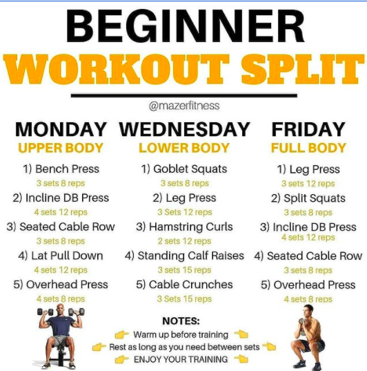 The primary goal for a beginner in weightlifting should be perfecting your mind-muscle connection. For example, most people have a basic mind-muscle connection with their biceps and are able to flex them on command. As for building that connection elsewhere in your body, the best way to do so is to slow down the movement and picture the specific muscle contracting and relaxing through the motion. In fact, a study by the European Journal of Sport Science found that “Over 8 weeks of training, the internal focused group [those who pictured the muscle contracting in their body] experienced significantly more muscle mass growth,” than the focus group that focused on just completing the rep. After some time, you can increase the frequency and eventually create a “split.”