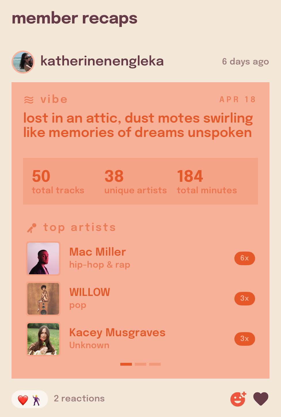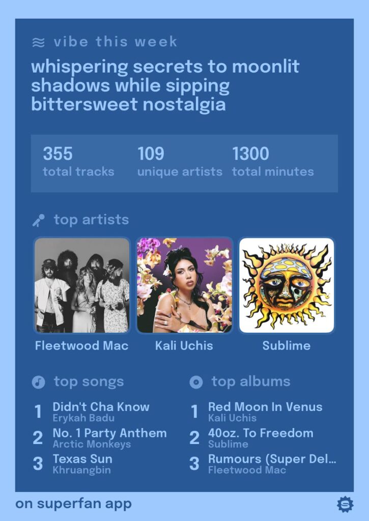 If the weekend isn’t already exciting enough, Superfan gives you a personalized recap of your listening habits every Friday at about 9pm. Using artificial intelligence, a clever caption is generated based on your top artists and genres. You can also see your top three artists, top three songs and top three genres, along with the number of times you listened to each.