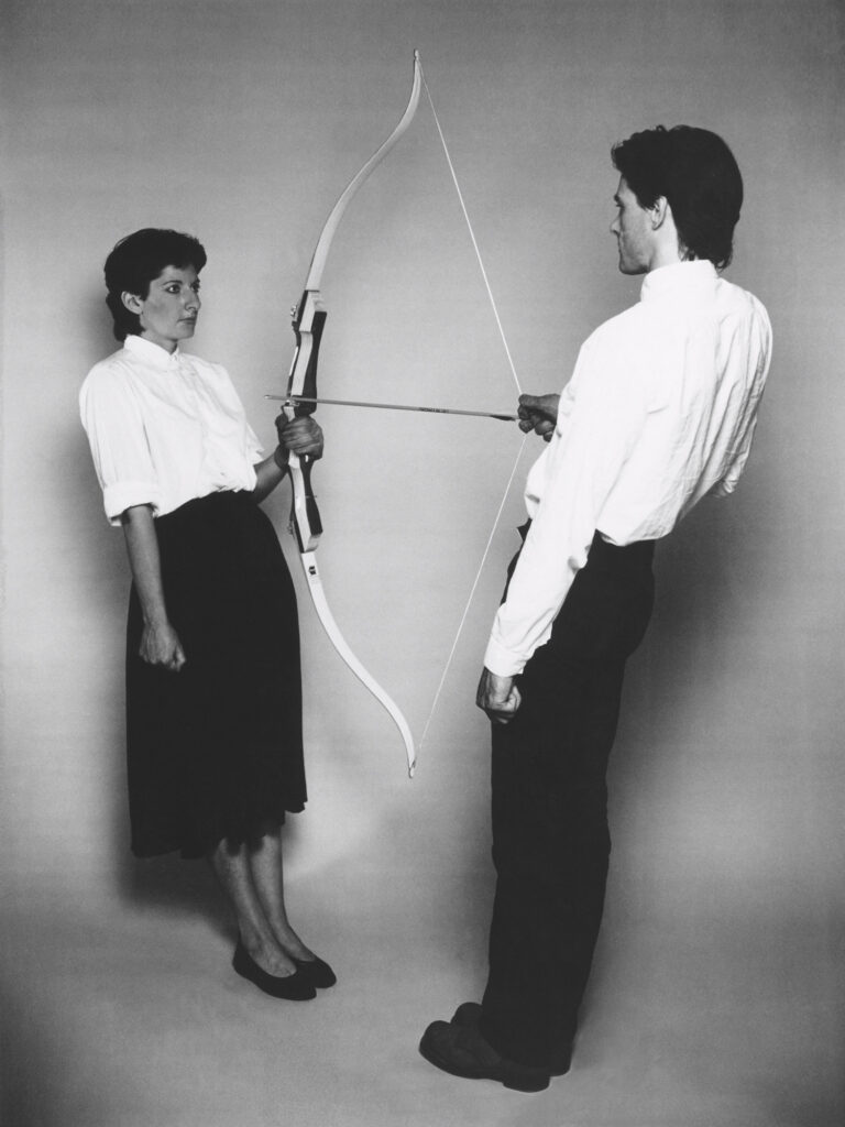“Rest Energy” (1980) is one of their most recognizable pieces. Together, they hold both sides of a bow and arrow, with the arrow pointed directly at Marina’s chest. At any moment, Ulay holds the power to shoot – a symbol of unwavering trust. Other performances they did include “Relation in Time” (1977), in which the two tied their hair together into a ponytail and sat there for 17 hours, “Breathing In/Breathing Out” (1977-78), in which they connected their mouths with a device and plugged their noses so that they can only breathe through each others mouths, breathing into each others lungs over and over until they both passed out, and “Imponderabilia” (1977), in which they both stood nude on opposite sides of a doorway, wanting to test if people who pass through the doorway will choose to face Marina or Ulay.