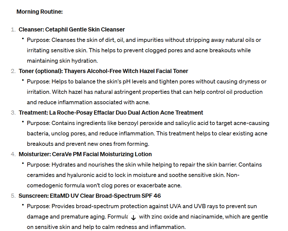 For example, VALLEY was curious about what skincare routine someone with sensitive skin should follow. To ChatGPT we went! The following prompt was all it took for ChatGPT to build the VALLEY team a personalized skincare routine, pulling information from a plethora of internet sources to back up its advocacy for certain products: